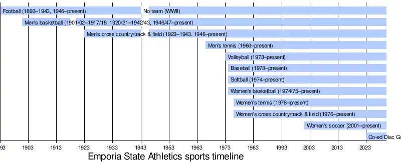 Emporia State has been a member of six conferences and two stints as an independent, since its athletics beginnings in 1893.[11]