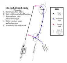 The end around was a submarine tactic[1] used when the position of a submarine (relative to a potential target) did not allow the submarine to mount an immediate attack. The submarine's crew estimated the enemy's bearing, heading, and speed, remaining submerged until out of the enemy's visual range. The submarine then surfaced and proceeded at maximum speed to a position in front of the target, near the target's predicted course but remaining out of view. The submarine would then submerge, approach, and attack.
