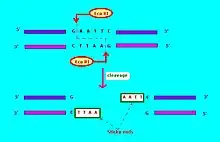 Restriction enzymes are endonucleases from eubacteria and archaea that recognize a specific DNA sequence.[3] The nucleotide sequence recognized for cleavage by a restriction enzyme is called the restriction site. Typically, a restriction site will be a palindromic sequence about four to six nucleotides long. Most restriction endonucleases cleave the DNA strand unevenly, leaving complementary single-stranded ends. These ends can reconnect through hybridization and are termed "sticky ends". Once paired, the phosphodiester bonds of the fragments can be joined by DNA ligase. There are hundreds of restriction endonucleases known, each attacking a different restriction site. The DNA fragments cleaved by the same endonuclease can be joined regardless of the origin of the DNA. Such DNA is called recombinant DNA; DNA formed by the joining of genes into new combinations.[4] Restriction endonucleases (restriction enzymes) are divided into three categories, Type I, Type II, and Type III, according to their mechanism of action. These enzymes are often used in genetic engineering to make recombinant DNA for introduction into bacterial, plant, or animal cells, as well as in synthetic biology.[5] One of the more famous endonucleases is Cas9.
