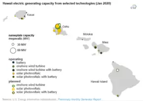 Ninety-nine percent of the population in Hawaii (outside of Kauai) is supplied by Hawaiian Electric Industries (HECO).[8] Kauai is supplied by consumer-owned Kauai Island Utility Cooperative. As of 2018, the total dispatchable capacity was 1,727 MW, and the intermittent generation capacity was 588 MW.[9] Each island generates its own power, unconnected to other islands.[10] The islands have several grid batteries.[11]