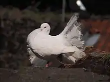 The English Fantail is a highly developed breed of fancy pigeon.[1] The Fantail, along with other varieties of domesticated pigeons, are all descendants of the rock dove (Columba livia). The Fantail is said to have originated in India, but there are early references to it in Spain and China.[2]