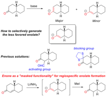 An enone can also serve as a precursor for regiospecific formation of an enolate, here the enone is a "masked functionality" for the enolate. This process is first described by Gilbert Stork[22] who is best known for his contributions to the study of selective enolate formation methods in organic synthesis. Reacting an enone with lithium metal generates the enolate at the α-carbon of the enone. The enolate product can either be trapped or alkylated. By using "masked functionality", it is possible to produce enolates that are not accessible by traditional methods.