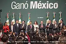 On 1 July 2012, Mexico's presidential election took place. In an initial, partial count issued that night, the Federal Electoral Institute (IFE) announced that based on a fast vote counting, Peña Nieto was leading the election with 38% of the votes.[44] His nearest competitor, Andrés Manuel López Obrador, was just 6 points behind him. The figures were meant to be a representative sample of the votes nationwide; but shortly after this announcement, Peña Nieto appeared on national television claiming victory. "This Sunday, Mexico won", he said. He then thanked his voters and promised to run a government "responsible and open to criticism." At the PRI headquarters in Mexico City, the victory party began.[44] With more than 97% of the votes counted on election day, the PRI had won with about 38% of the votes, 6.4 points above the leftist candidate López Obrador of the Party of the Democratic Revolution (PRD), who refused to concede to the results and had threatened to challenge the outcome, criticizing the PRI for allegedly engaging in vote buying and receiving illegal campaign contributions.[45][46]