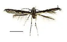The length of the forewings is 7−8.5 mm. The forewings are greyish brown to deep brown and the costal margin has three parallel white striae obliquely extending outward from the basal one-third, halfway and three-fourths respectively, the first and third striae broad and short, reaching one-thirds of the wing width, the second stria narrow and long, reaching midwing. There is a broad creamy white band extending from the base to the tornus along the dorsal margin, its upper margin extended to a broad, ill-defined white stria at two-fifths, reaching below the fold dorsally, the second white stria from two-thirds obliquely outward to meet the second costal stria at midwing, the third stria from beyond the second one and parallel with it to the midwing, sometimes meeting the third costal stria. There is a silvery fascia with metallic reflection from the costal five-sixths to the dorsal margin, slightly arched outward medially. The distal one-sixth is yellowish brown, with a central black dot, with a small white dot at the costa and a white streak along the dorsal margin. The hindwings are grey to deep grey, sometimes with the basal one-third densely covered with rough black scales.