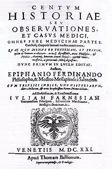 Epifanio Ferdinando was born in Mesagne, in the Terra di Otranto, on 2 November 1569. He cultivated the study of the Latin and Greek poets at an early age, and wrote elegant verses in both these languages.[4] In 1583 he went to Naples with the intention of going through the courses of philosophy and medicine; but in 1591, all strangers were compelled to leave the place. Ferdinando, returning to his own country, taught geometry and philosophy until 1594, when the viceroy's edict being revoked, he returned to Naples, pursued a course of medical studies, and received the degree of doctor in medicine and philosophy.[1] He then returned to his native home, where he settled himself and remained to the end of his life, notwithstanding the tempting offers he received from several universities. The Duke of Parma Ranuccio Farnese, in particular, pressed him to take the professorship of medicine in the university of his city;[5] and the same invitation, was given from the University of Padua. In 1605, he was elected syndic-general of his country.[6] He died in Mesagne on 6 December 1638, aged 69.[7]