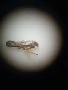 The wingspan is 10โ€“11 mm. The forewings are whitish densely irrorated (sprinkled) with black, appearing grey. There is a suffused blackish spot in the disc before the middle, another on the anal angle, and a third less apparent towards the apex. The hindwings are grey.