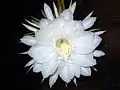 The flowers are nocturnal. They grow on flattened stems and are up to 30 cm (12 in) long and 17 cm (7 in) wide, and very fragrant. The principal odor components in the aroma are benzyl salicylate and methyl linoleate.[6] Pericarpels are nude, slightly angled, and green. Bracteoles are short and narrow up through ca. 10 millimetres (0.39 in) long. Receptacles are up through 20 cm long, 1 cm thick, brownish, and arching. The outer tepals are linear, acute, 8–10 cm long, and reddish through amber. The inner tepals are whitish, oblanceolate or oblong, acuminate, up through 8–10 cm long and 2.5 centimetres (0.98 in) wide. The stamens are greenish white or white, slender and weak. The styles are greenish white, pale yellow, or white, 4 mm thick, as long as inner tepals, and with many lobes.