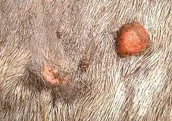 Skin cancer, or neoplasia, is the most common type of cancer diagnosed in horses, accounting for 45[1] to 80%[2] of all cancers diagnosed. Sarcoids are the most common type of skin neoplasm and are the most common type of cancer overall in horses. Squamous-cell carcinoma is the second-most prevalent skin cancer, followed by melanoma.[3] Squamous-cell carcinoma and melanoma usually occur in horses greater than 9-years-old,[3] while sarcoids commonly affect horses 3 to 6 years old. Surgical biopsy is the method of choice for diagnosis of most equine skin cancers,[1] but is contraindicated for cases of sarcoids.[4] Prognosis and treatment effectiveness varies based on type of cancer, degree of local tissue destruction, evidence of spread to other organs (metastasis) and location of the tumor. Not all cancers metastasize and some can be cured or mitigated by surgical removal of the cancerous tissue or through use of chemotherapeutic drugs.