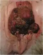 Squamous-cell carcinoma on the vulva of a gray mare, possibly arising from the clitoris. The tumor is ulcerated and has multiple necrotic areas (black spots).