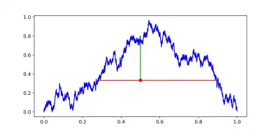 A Brownian excursion . Here, the process has a single point, marked with a red dot. The red line corresponds to a single internal node of the associated tree , the green line corresponds to a leaf of . If one adds an edge between the two nodes, one obtains a graph with a single cycle