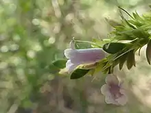 The flowers are borne in groups of 3 or 4 in leaf axils on stalks 2–3 mm (0.08–0.1 in) long which often have white blotches. There are 5 green, oblong to lance-shaped sepals which are mostly 3–5.5 mm (0.1–0.2 in) long. The petals are 8–13.5 mm (0.3–0.5 in) long and are joined at their lower end to form a tube. The tube is pale lilac on the outside and a deeper lilac inside with light purple spots in the tube. The outside of the petal tube is densely covered with glandular hairs but the inside surface of the petal lobes is glabrous while the inside of the tube is filled with long, soft hairs. The 4 stamens are fully enclosed in the petal tube. Flowering occurs between September and November in its native range and the fruits which follow are ovoid to cylindrical and up to 3.5 mm (0.1 in) long.[2][3][4][5]