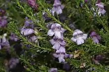 The flowers are borne singly in leaf axils on straight, glabrous, sticky stalks, 3–9 mm (0.1–0.4 in) long. There are 5 green, overlapping, egg-shaped, sticky sepals which are 2–3.5 mm (0.08–0.1 in) long. The petals are 9–15 mm (0.4–0.6 in) long and are joined at their lower end to form a cylindrical tube. The petal tube is mauve, blue or lilac-coloured, white with yellow-brown spots inside. The petal tube and lobes are glabrous except for the inside of the tube which has long, soft hairs. The 4 stamens are enclosed in the petal tube. Flowering occurs between September and October and is followed by fruits which are dry, woody, oval-shaped and about 3 mm (0.1 in) long.[2][3]