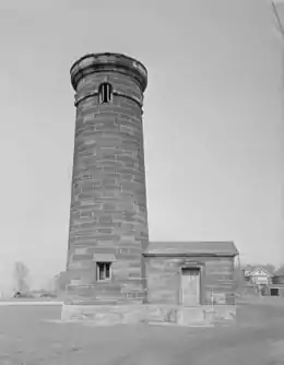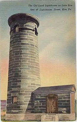In 1810, Congress authorized the construction and appropriated $1,600 for the first two lighthouses on the Great Lakes; one to be located at "the junction of Buffalo Creek and Lake Erie" and the other "on or near Presq' isle [sic]".[4][5] A total of 2 to 4 acres (1 to 2 ha) of land overlooking the entrance to the channel into Presque Isle Bay was ceded by Brigadier General John Kelso of the Pennsylvania militia on April 2, 1811 for the lighthouse.[6][7] Both the construction of the Buffalo Main Light and the Erie Land Light were delayed until 1818.[5]