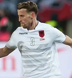 He made his debut for Albania on 15 November 2013 in a friendly match, the first one after the end of the qualification campaign against Belarus playing the full 90 minutes match, which finished in a 0–0 draw.[33][34] He received another call up for the next friendly match on 5 March 2014 against Malta.[35]