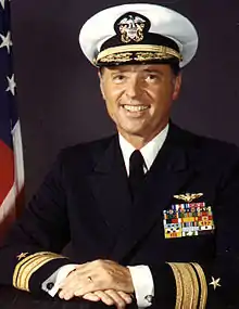 His military awards include two Silver Stars, two Defense Superior Service Medals, two awards of the Legion of Merit, five Distinguished Flying Crosses, twenty-seven Air Medals, five Navy Commendation Medals and service medals for the World War II, Korean and Vietnam conflicts.[3] He flew 50 combat missions in Korea, flying the F4U Corsair from the aircraft carrier USS Princeton, and 250 combat missions in Vietnam as a squadron and air wing commander. In 1967 he became the third naval aviator to achieve 1,000 arrested carrier landings, accomplished without accident over 20 years, flying 11 aircraft types from 15 aircraft carriers.[4]