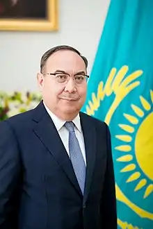 Erzhan Hozeuly Kazykhanov (born 21 August 1964) is a Kazakh politician who serves as diplomat. Kazykhanov holds a newly created position in the presidential administration with the title of Special Representative for International Cooperation.[1] Prior to his appointment as the Ambassador to the U.S., Kazykhanov has served as Kazakhstan's Ambassador to the United Kingdom of Great Britain and Northern Ireland. Before becoming Ambassador to the UK, he held the position of Assistant to the President of the Republic of Kazakhstan and Minister of Foreign Affairs of Kazakhstan. He previously served as the Deputy Minister of Foreign Affairs of Kazakhstan, as well as the Ambassador of Kazakhstan to Austria, Permanent Representative of Kazakhstan to the International Organizations in Vienna and Permanent Representative to the United Nations in New York.