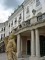 The first architect to work on the project was Johann Ferdinand Mödlhammer, succeeded in 1765 by Melchior Hefele.[1] While the palace is often compared to Versailles, which the Prince had visited in 1764 when he visited Paris,[2][3] H. C. Robbins Landon claims that a more direct influence can be found in "Austrian prototypes, particularly Schönbrunn palace in Vienna." Three of the windows above the main entrance are designed as homage to strings instruments, violin, viola, cello.