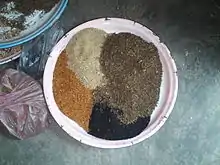 Berbere, a combination of powdered chili pepper and other spices (cardamom, fenugreek, coriander, cloves, ginger, nutmeg, cumin and allspice)[5] is an important ingredient used to add flavor to many varied dishes like chicken stews and baked fish dishes. Also essential is niter kibbeh, a clarified butter infused with ginger, garlic, and several spices.[6][7]