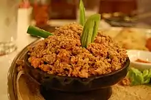 A typical dish consists of injera accompanied by a spicy stew, which frequently includes beef, lamb, vegetables and various types of legumes, such as lentils is traditionally consumed on the mesob.[3] The cuisines of the Southern Nations, Nationalities and People's Region and the Sidama region also make use of the false banana plant (enset, Ge'ez: እንሰት ïnset), a type of ensete. The plant is pulverized and fermented to make various foods, including a bread-like food called kocho (Ge'ez: ቆጮ ḳōč̣ō), which is eaten with kitfo.[4] The root of this plant may be powdered and prepared as a hot drink called bulla (Ge'ez: ቡላ būlā), which is often given to those who are tired or ill. Another typical Gurage preparation is coffee with butter (kebbeh). Kita herb bread is also baked.