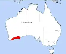 The distribution of the square-fruited mallee is limited to coastal sandplains where it is also found among granite outcrops of southern Western Australia, north from the Stirling Ranges and south to around Albany east to Israelite Bay in the Great Southern and Goldfields-Esperance regions where it grows in white or grey sandy soils in heath.[3][7]