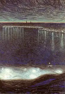 He lived his whole life together with his mother and brother at Södermalm, the southern part of Stockholm. They eventually settled in a flat at No. 40 Bastugatan, on a height with a view over most of central Stockholm including the Riddarfjärden bay and the Old town. Most of his paintings from the 1890s up to 1904 are night views over Riddarfjärden, as he would have seen it from his home, or street views from various parts of Södermalm. They are dominated by shades of blue and very visible brush strokes, often crossing one another. Over the years his paintings moved towards increasing simplification and abstraction, and at the end of his "blue" period, little more than the street lights and their reflections in the waters can be discerned from the mass of blue of the canvas.