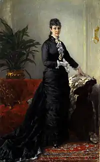 A young woman in a long black dress, ca. 1878
