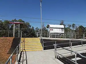 The station today consists of one platform with a steel shelter. In 2009, the platform was extended with scaffolding and plywood materials.[4] Initially intended as an interim arrangement until a permanent extension was built, the temporary platform remained until December 2019.[5] A permanent reconstruction of the platform commenced in May 2019 and was completed by December 2019.[6] Eumundi, unlike most other stations on the line, doesn't have a passing loop, although these exists a few kilometres north and south of the station.