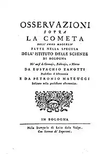 - ↑ "XV. The parabolic orbit for the comet of 1739. Observed by Signor Eustachio Zanotti at Bologna". Philosophical Transactions of the Royal Society of London. 41 (452): 809. 1740-12-31. doi:10.1098/rstl.1739.0145. ISSN 0261-0523. S2CID 186214215.