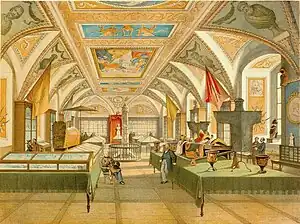 Tyszkiewicz started making plans for a learned society, in the vacuum created by the closure of Vilnius University in 1832, after moving to Vilnius in 1835. At the suggestion of Theodor Narbut, he also started thinking about a history museum.[5] In 1843, he toured Scandinavian countries, establishing contacts with various historical societies and gathering ideas for the future museum. He purchased a house in Antakalnis and opened a cabinet of antiquities for the public in 1847.[5] He petitioned the Tsarist administration for permission to open a public museum twice, in 1848 and 1851, but the Museum of Antiquities was approved only in 1855.[15] The Vilnius Archaeological Commission, which Tyszkiewicz chaired, acted as a de facto learned society.[15] The museum was popular and its collections grew tenfold from 6,000 items donated by Tyszkiewicz to more than 67,000 items in 1865.[16] After the failed Uprising of 1863, the Tsarist authorities instituted a number of strict Russification policies and nationalized the museum. Many valuable items, particularly those related to the former Polish–Lithuanian Commonwealth, were removed to the Rumyantsev Museum in Moscow.[17] Tyszkiewicz formally oversaw the transformation of the museum into a department of the Vilnius Public Library and officially resigned from the museum in September 1867.[15]