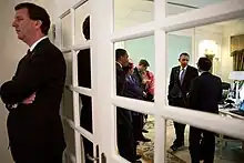 ![]() President Barack Obama is reflected in a mirror as he speaks with Evan Medeiros, Senior Director for East Asian Affairs, prior to a joint press conference with Prime Minister Najib Razak at the Prime Minister's residence in Kuala Lumpur, Malaysia, April 27, 2014. Trip Director Marvin Nicholson stands at far left. (Official White House Photo by Pete Souza) | |