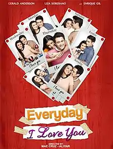 Everyday I Love You is a 2015 Filipino romantic-drama film directed by Mae Cruz-Alviar. The screenplay is from writers Vanessa R. Valdez, Kookai Labayen, Iris Lacap, and Gilliann Ebreo. The film stars the year's breakthrough love team, Enrique Gil and Liza Soberano, together with Gerald Anderson. It was released October 28, 2015, and made 16 million pesos on its first day of showing and received generally positive reviews from critics.