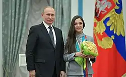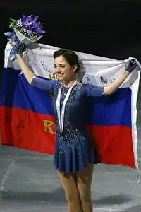 Evgenia Armanovna Medvedeva (alt. spelling: Yevgenia Medvedeva;[1] Russian: Евгения Армановна Медведева, IPA: [jɪvˈɡʲenʲɪjə mʲɪˈdvʲedʲɪvə]; born 19 November 1999), is a retired competitive Russian figure skater. She is the 2018 PyeongChang Olympic silver medalist (2018 ladies' singles, 2018 team event), a two-time world champion (2016, 2017), a two-time European champion (2016, 2017), a two-time Grand Prix Final champion (2015, 2016), a two-time Russian national champion (2016, 2017), silver medalist at the 2018 European Figure Skating Championships and bronze medalist at the 2019 World Championships. Earlier in her career, she won the 2015 World Junior Championships, the 2014 Junior Grand Prix Final, and the 2015 Russian Junior Championships.[2]
