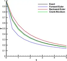 with the initial condition Consider a grid for 0  k  n, that is, the time step is and denote for each . Discretize this equation using the simplest explicit and implicit methods, which are the forward Euler and backward Euler methods (see numerical ordinary differential equations) and compare the obtained schemes.