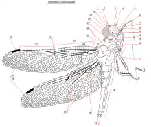 Exoskeleton of head, thorax, and first two abdominal segments:[3] A. Austrophlebia costalis (dragonfly), female; dorsal view. B. The same, ventral view. C. The same, lateral view. D. Head of the same, front view. E. Head of Lestes (damselfly), dorsal view. F. The same, lateral view. G. Metathorax of Orthetrum (dragonfly), ventral view. An analis (anal vein); A' secondary analis (anal vein); ac anteclypeus; alr ante-alar ridge; ant antenna; ap costal process; As urosternite; At urotergite; ax axillary; C costa (vein); Cu cubitus (vein); cx coxa; dr dorsal carina; e eye; epic epicranium; epm epimerum; eps episternum; fr frons; fr1 its superior, fr2 its anterior portion; Fw fore-wing; g gena: hs humeral suture; Hw hind-wing; ips infra-episternum; ll lateral lobe of labium; lm labium; lr labrum; ls1 first, ls2 second lateral suture; M media (vein); mb membranule; md mandible; me median eye-line; ml median lobe of labium; mt mentum; N notum; occ occiput; ocl lateral ocellus, ocm median ocellus; orb orbit; ot occipital triangle; P prothorax; pc postclypeus; Pl pleurum; PN postnotum; pol postocular lobe; PS post-sternum ; R radius (vein); S sternum; Sc subcosta (vein); Sp spiracle; t temple; v vertex; vt vertical tubercle.