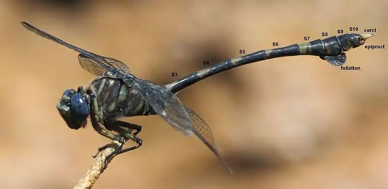 Male dragonfly (Ictinogomphus ferox) showing abdomen with annotated segments 3-10 (S3-S10), appendages and foliations