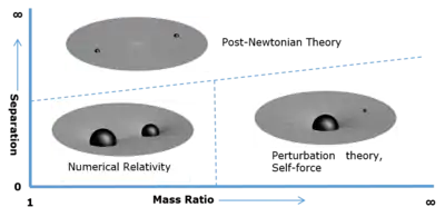 One common approach is to expand the equations of motion for an object in terms of its velocity divided by the speed of light, v/c. This approximation is very effective if the velocity is very small, but becomes rather inaccurate if v/c becomes larger than about 0.3. For binary systems of comparable mass, this limit is not reached until the last few cycles of the orbit. EMRIs, however, spend their last thousand to a million cycles in this regime, making the post-Newtonian expansion an inappropriate tool.[1]
