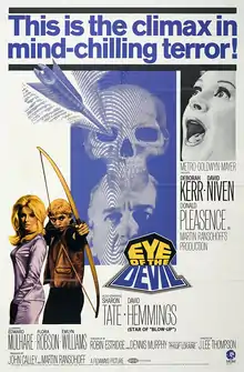 Eye of the Devil, also known by its working title 13[2] or Thirteen,[3] is a 1966 British mystery horror film directed by J. Lee Thompson and starring Deborah Kerr, David Niven, Donald Pleasence, Sharon Tate and David Hemmings. Based on the 1964 novel Day of the Arrow by Robin Estridge,[3] the movie is set in rural France. It was shot at the Château de Hautefort and in England.[4]