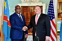 On 10 January 2019, it was announced that Tshisekedi had won the presidency of the DRC in the December 2018 election.[12] He defeated another opposition leader, Martin Fayulu, and Emmanuel Ramazani Shadary, who was supported by term-limited outgoing President Kabila, who had been president for 18 years. Fayulu, the runner-up, alleged vote rigging and challenged the election results.[13] On 19 January, the Constitutional Court, dismissed the challenge, officially making Tshisekedi president-elect.[14] He was sworn in as president on 24 January 2019,[15] taking office the next day.[3] This marked the first time since the Congo gained independence in 1960 that an incumbent president peacefully transferred power to the opposition.[16]