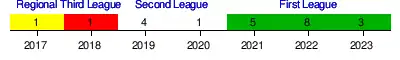 | 2018–19 | Second League | 2 | 30 | 16 | 11 | 3 | 39 | 18 | 21 | 59 | 4th | Round of 32 | DNE | 21 | ||