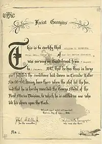 When the medals were ready, Lieutenant Frank Farrell, the 7th Marines' intelligence officer and former feature editor of the New York World-Telegram, was assigned to write the text and handle the printing of the certificates. Second Lieutenant John C. Schiller Jr. was charged with collecting the fee and Lt. Col. (later Col.) Edmond J. Buckley was appointed "Grand Master of the Order"[4] and signed several of the certificates.