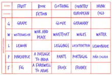 Each game set includes a number of cards, each containing one or more Class (such as "Book titles"); within each Class may be one or more Category (such as "Fiction", "Non-fiction", "Romance", "Detective"). The game also includes tiles, one for each letter of the alphabet, a five-minute sand timer, and scorecards.