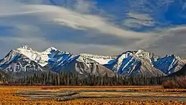The Fairholme Range is a mountain range east of the Bow River valley in the Canadian Rockies. The range is bounded on the west side by the Trans-Canada Highway as it passes through the towns of Exshaw and Canmore, while the northern section of the range extends into Banff National Park to the southern shores of Lake Minnewanka.[4] John Palliser named the range in 1859 after his sister Grace Fairholme, who had married William Fairholme.[5]