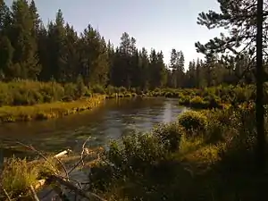 The Fall River is a tributary of the Deschutes River[6] in the Deschutes National Forest in Deschutes County, Oregon, United States.[3] The source is a spring approximately 2 miles (3 km) northwest of Pringle Falls. The river flows to the northeast and is about 12 miles (19 km) long.[5] Fly fishing is permitted.
