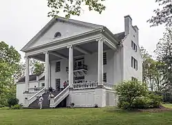 The three-story double-pile house is three bays wide with a center hall, resting on a very high raised basement. The end walls have parapets above the roofline, incorporating prominent double chimneys on either end. The house is limestone faced with stucco. Large porticoes were added on either main elevation around 1900.[2]