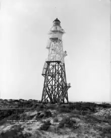 The drifting sand dunes of Farewell Spit are low lying and interspersed with fresh water lagoons, with an extensive shoal area on the southern side.[3] The need for a lighthouse to warn mariners was identified in 1856, in the days of early European settlement,[4] in response to a growing number of stranding and wrecks. An initial proposal was made for a floating lighthouse, moored 2 miles (3.2 km) off the end of the spit.[5] In 1866, there were protests about government delays in establishing a lighthouse on Farewell Spit.[6] Eventually, under the direction of James Balfour, Colonial Marine Engineer and Superintendent of Lighthouses, a design was prepared for a lighthouse to be built at Bush End Point, near the end of the sandspit.[7] The first lighthouse was constructed on a wooden lattice tower in 1870. However, it was no match for the abrasive sand and salt-laden winds. Tenders were called in December 1894 for a replacement steel lattice tower,[8] and a new lighthouse was commissioned in January 1897.[2]