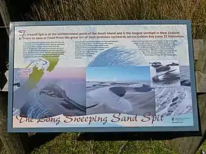 - ↑ The Long Sweeping Sand Spit (Interpretation panel Port Pūponga, at base of the spit). Fossil Point: Department of Conservation. 2016.