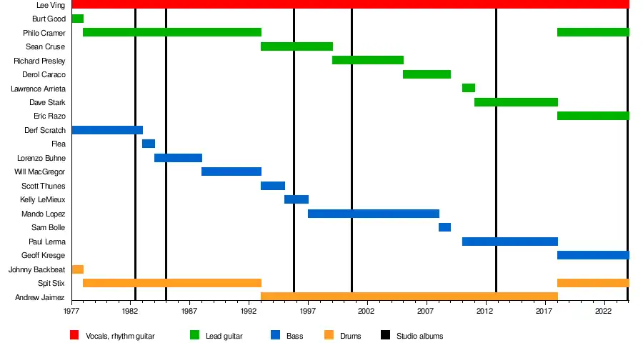 | Past members | Derf Scratch Burt Good Johnny Backbeat Eric Feldman Flea Lorenzo Buhne Will MacGregor Scott Thunes Kelly LeMieux Mando Lopez Sean Cruse Richard Presley Derol Caraco Jeffery “Beldo” Beller Sam Bolle Lawrence Arrieta Andrew Jaimez Paul Lerma Dave Stark Tommy Ufkes |