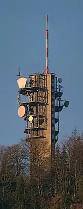 The tower has a triangular form with cut edges, is 51 metres (167 ft) high and has a 22 metres (72 ft) high pole on its top. It has 16 floors and an underground building for technical equipment. The antennas are on the terraces of the 5 top floors and on the roof. For its directional radio system there are parabolic antennas, horn and shell antennas. The power for directional radio is quite small in comparison to the Uetliberg TV-tower: 10W at the maximum for a connection from Felsenegg to Chasseral of about 110 kilometres (68 mi).[3]
