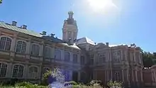 Construction of the southern wing of the monastery building, from the Holy Trinity Cathedral to the southern boundary of the monastery, began in 1725, overseen by Leonard Theodor Schwertfeger.[1] Construction stalled in 1730, and only resumed in 1741 under Pietro Antonio Trezzini.[2] The two-storey wing was finally completed under the auspices of Ivan Rossi in 1748. The south-eastern corner continued the style of the north Dukhovsky wing, and like that wing, was finished with a two-storey church, laid down on 9 August 1745, and intended to be the symmetrical counterpart of the Annunciation Church.[1][3][4] Construction of the church lasted for seven years, with further work to attach a staircase carried out between 1755 and 1761 by M. D. Rastorguev.[1][5] The decoration was completed by 1766.[2] As completed the church building contained two churches, one on the ground floor and one on the upper floor.[3] The icons were painted by Aleksey Antropov.[1] The churches were only consecrated in 1770; the upper one in the name of Holy Prince Feodor of Yaroslav, brother of Saint Alexander Nevsky; and the lower one in the name of Saint John Chrysostom.[1][2][3]