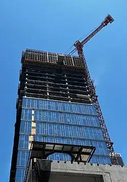 In February 2020, officials broke ground on the project. Crews cleared the site of its parking lot before beginning construction at a later date.[1] Australian multinational construction company Lendlease was selected as the project's contractor.[6] In March 2021, a crane arrived on the site and vertical construction began.[7] On October 7, 2022, officials announced the topping out of the building.[2] In November 2023, Mitsui began leasing units with an expected move-in date in early 2024.[8]